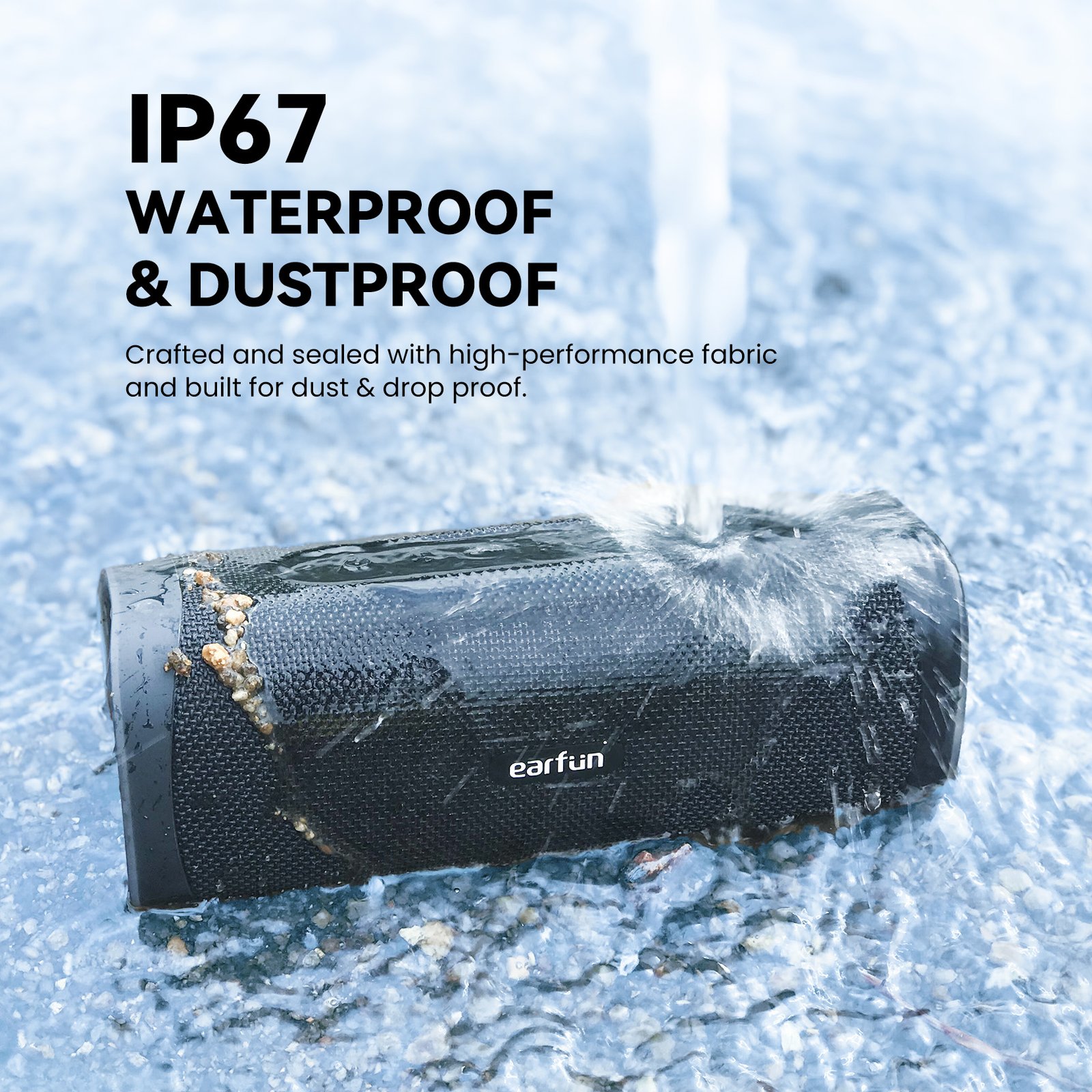 IP67 მტვერგაუმტარი და წყალგაუმტარი უსადენო სპიკერი წყალგაუმტარია (IP67), დაცულია EarFun-ის ინოვაციური Sweatshield ტექნოლოგიით, დამზადებულია დალუქული და წყალგაუმტარი მასალებით.