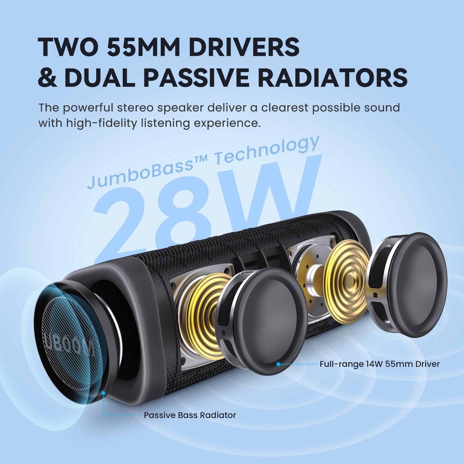 ორი 55მმ დრაივერი და პასიური რადიატორები – იგრძენი ბასის ბიძგი განახლებული ორი მაღალი სენსიტიურობის დრაივერი უზრუნველყოფს სტერეო ხმას განსაკუთრებული სიწმინდითა და ნულოვანი დამახინჯებით. ორი გარე პასიური რადიატორი თვალსაჩინოდ აჩვენებს, თუ რამდენად ძლიერია ეს Bluetooth სპიკერი. ბასი არამარტო გესმის, არამედ გრძნობ და ხედავ კიდეც.