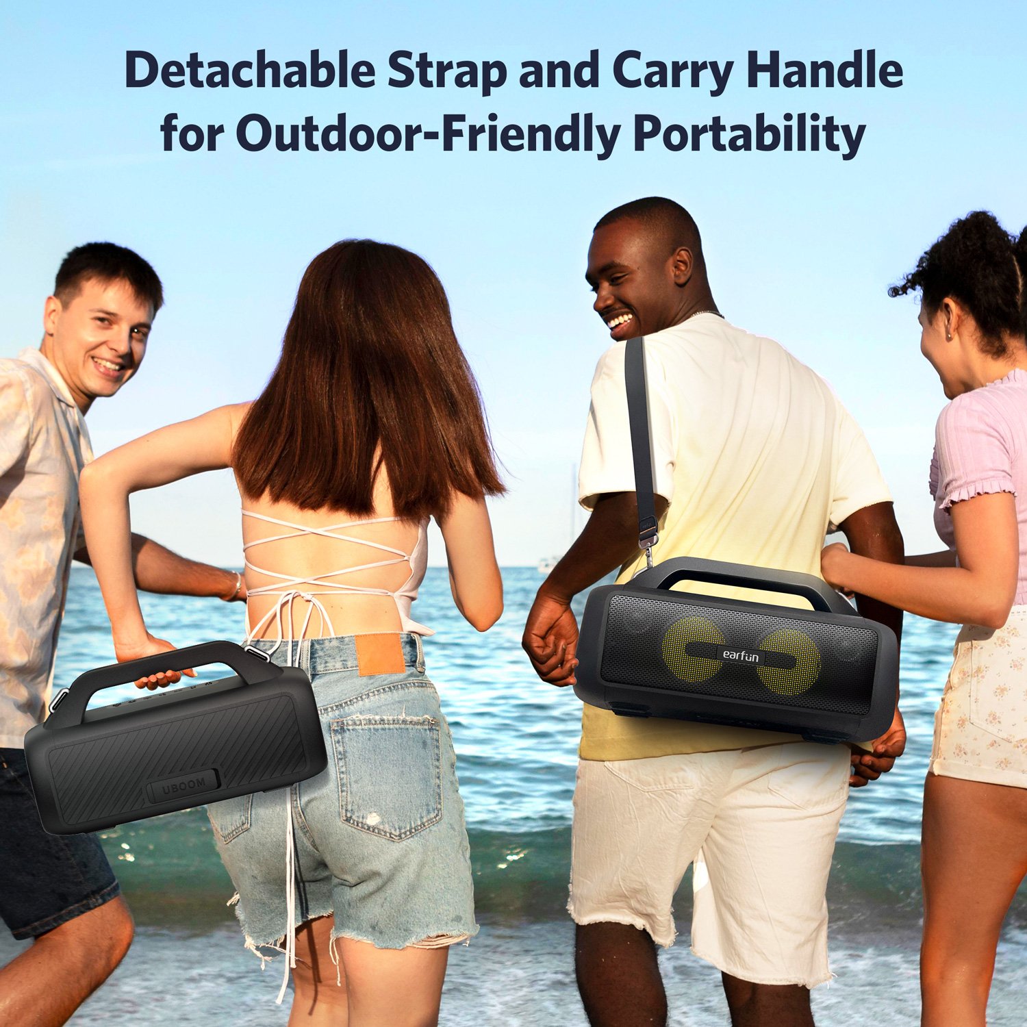 IP67 წყალგამძლე და მტვრისგან დაცული UBOOM X შექმნილია გარე გამოყენებისთვის – SweatShield ტექნოლოგია იცავს ტენიანობისა და მტვრისგან. კომპლექტში შესული სახელური ქმნის მეტ კომფორტს – იდეალურია სანაპიროზე, აუზზე ან ნებისმიერ თავშეყრის ადგილას წასაღებად.