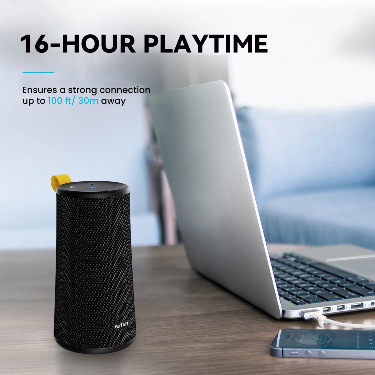 Bluetooth 5.0 და 16 საათიანი სუპერგამძლე ბატარია Bluetooth 5.0 ჩიპის მეშვეობით, სპიკერის კავშირის არე 400%-ით გაიზარდა და მაქსიმალური მანძილი 30 მეტრამდეა, რაც უზრუნველყოფს სწრაფ და სტაბილურ კავშირს. დამატებით, გააჩნია 3.5მმ AUX პორტი არაბლუთუზ მოწყობილობებთან დასაკავშირებლად. ჩაშენებული მაღალი მოცულობის ბატარია იძლევა უწყვეტი მუშაობის შესაძლებლობას 16 საათის განმავლობაში — დატკბი მუსიკით მთელი დღე!