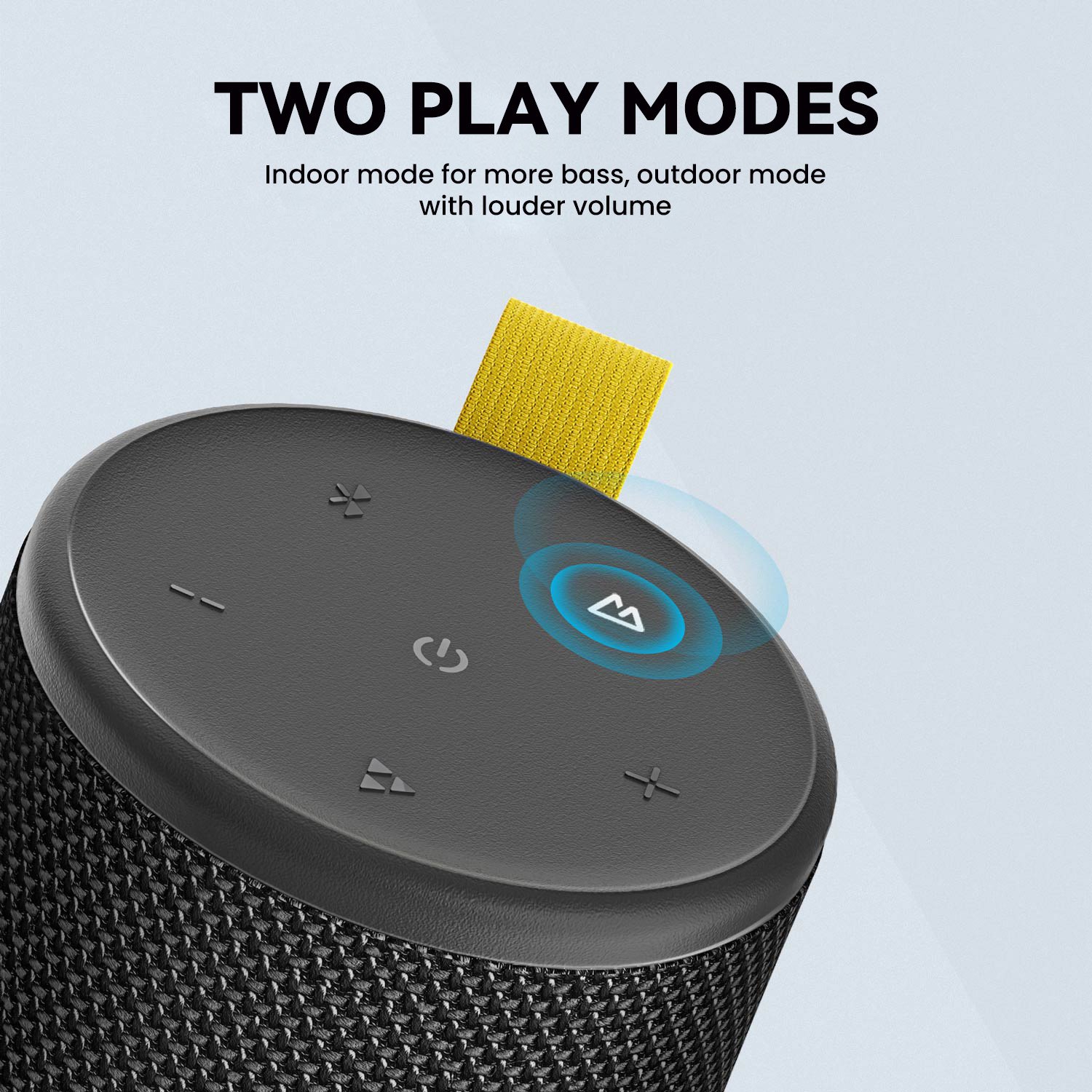 2 ხმის რეჟიმი – შიდა და გარე “Indoor Mode” ანუ შიდა რეჟიმი ბასის გაძლიერებაზეა ორიენტირებული, იდეალურია სახლის პირობებში ან მანქანაში. “Outdoor Mode” ანუ გარე რეჟიმი – ძლიერ ხმაზეა გათვლილი და განკუთვნილია ღია სივრცისთვის. შესაფერისია გარე აქტივობებისთვის, როგორიცაა ველოსიპედით გასეირნება, პიკნიკი, სანაპიროზე დასვენება და სხვა. ხმის რეჟიმების გადართვა შესაძლებელია გამოყენების ადგილის მიხედვით.